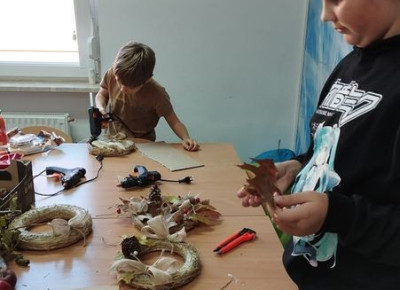 Podczas warsztatów nasi najmłodsi mieli okazję stworzyć jesienne wieńce, które samodzielnie ozdabiali według własnego, kreatywnego projektu. Wykorzystaliśmy dary jesieni - m.in. liście, szyszki, orzechy, co w rezultacie stworzyło niesamowitą kompozycję. Serdeczne podziękowania kierujemy do Pani Marii Pieniądz, która w przemiłej atmosferze przeprowadziła warsztaty i pokazała nam wszystkim jakie cuda można wyczarować z rzeczy, które wprost leżą pod naszymi nogami. Dziękujemy!